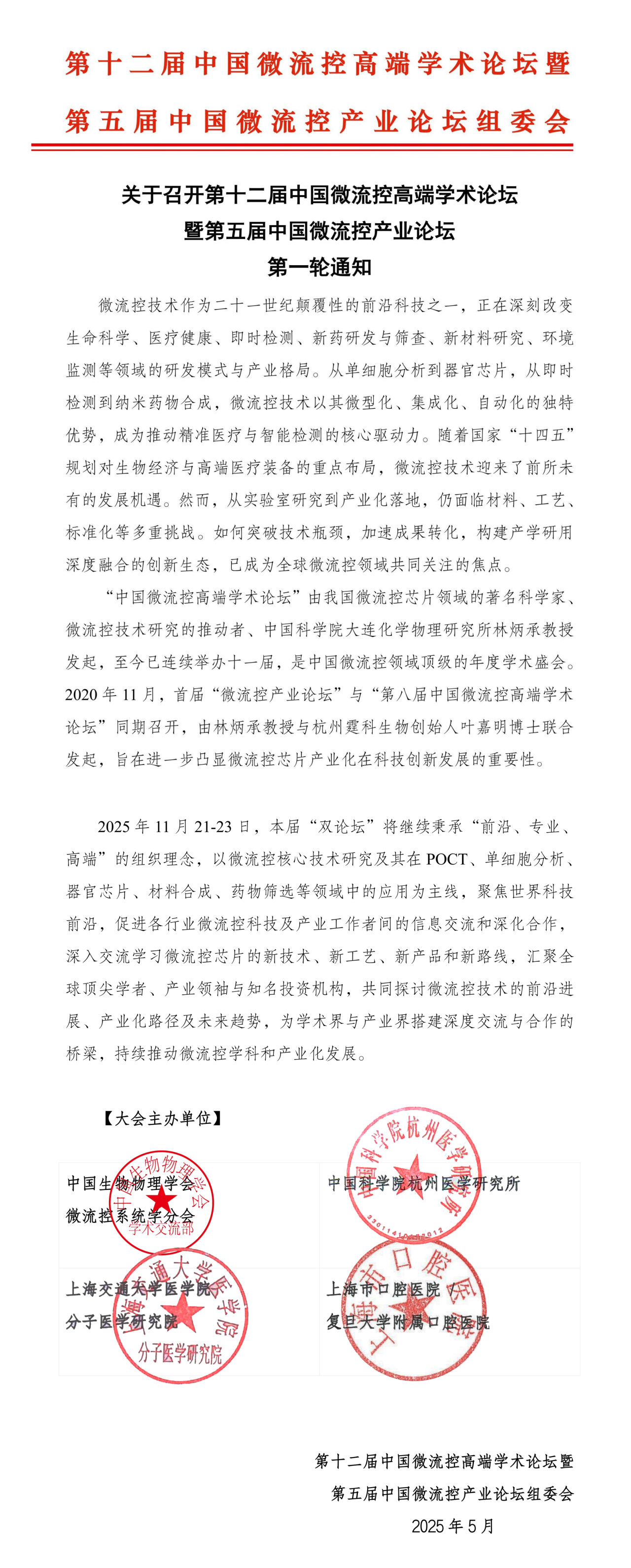 主办单位:中国生物物理学会微流控系统学分会、中国科学院杭州医学研究所、上海交通大学医学院分子医学研究院、上海市口腔医院/复旦大学附属口腔医院